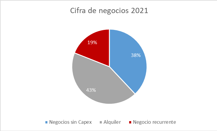 Los negocios sin Capex (aquellos que no requieren de inversión adicional, tales como Distribución, Formación, Mantenimiento o Compraventa), crecen un 42% hasta los 62,9 millones de euros. El mayor peso de estos negocios, que no requieren de inversión adicional, hace que el EBIT aumente un 22% y se duplique el beneficio.