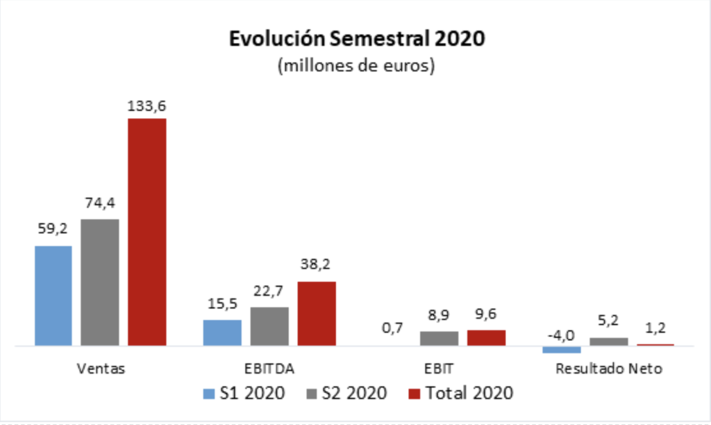 La evolución de la actividad en el segundo semestre (S2) ha sido muy positiva y, comparativamente con la primera parte del año (S1), la cifra de negocio creció un 26% y el EBITDA un 47%, para arrojar un beneficio de 5,1 millones de euros durante ese período, lo que compensó con creces el impacto negativo del primer semestre (ventas de 59,2 millones Vs. los 71,9 millones del S1 de 2019 y pérdidas de 4 millones de euros).