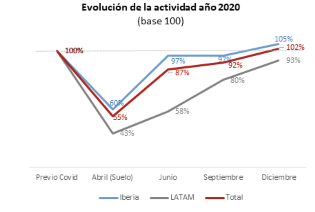 La alta diversificación en servicios y en las líneas de negocio ha hecho que se hayan recuperado tasas de actividad elevadas de manera rápida, consiguiendo una “recuperación en V”. Así, en el punto más bajo, la compañía ha mantenido un 55% de su actividad previa al inicio de la pandemia y, a cierre de ejercicio, la actividad se ha recuperado totalmente en el mercado doméstico, siendo algo más lento el comportamiento en Latam.