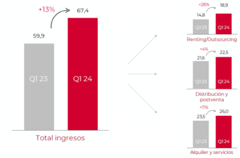 - El renting/outsourcing (negocio recurrente de alquiler a largo plazo) crece un 28%, alcanza los 18,9 millones y supone un 28% de los ingresos totales, aportando estabilidad y recurrencia en la generación de ingresos.