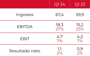 El crecimiento de la compañía, que ha venido acompañado de una mejora del margen, se traduce en unos ingresos de 67,4 mill. (+13%), y un EBITDA de 18,3 mill (+20%), lo que supone un 27% sobre ventas y una mejora de 2 puntos con respecto al mismo periodo de 2023, ha venido acompañado de una mejora del margen.