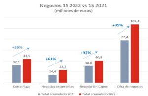 Desta forma, as vendas por serviços recorrentes (longo prazo) aumentaram 61% até aos 23,2 milhões de euros. A carteira contratada, com ciclos médios de quatro anos, aumenta 71% face ao mesmo período do ano anterior, tendo-se contratado, no ano de 2022, 36 milhões de euros adicionais neste tipo de serviços.