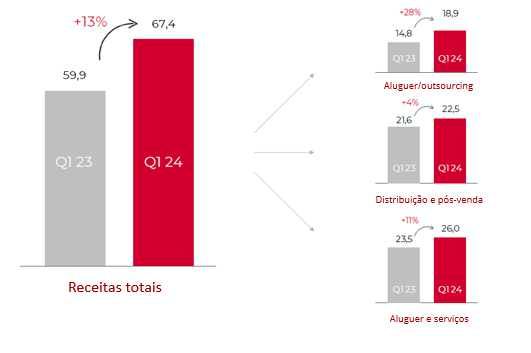 - O aluguer/outsourcing (atividade recorrente de aluguer de longa duração) cresceu 28 % para 18,9 milhões e representou 28 % das receitas totais, proporcionando estabilidade e recorrência na geração de receitas.