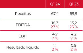 O crescimento da empresa, que foi acompanhado por uma melhoria da margem, resultou em receitas de 67,4 milhões de euros. (+13 %), e o EBITDA de 18,3M (+20 %), representando 27 % das vendas e uma melhoria de 2 p.p. em relação ao mesmo período de 2023, foi acompanhado por uma melhoria da margem.