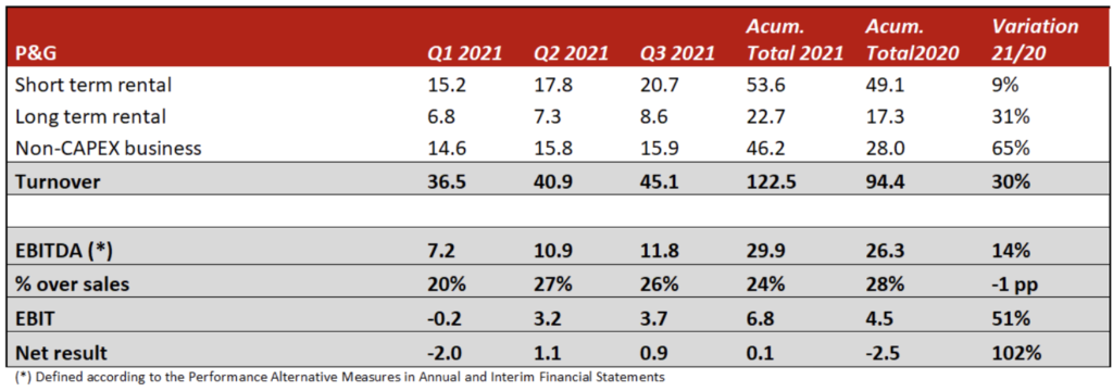 The short-term business, the one that has mostly suffered the impact of the pandemic, grows now 9% over 2020. The long-term business increases 31% and it already represents 18% of the total incomes of the company, while the non-CAPEX business (those that do not require additional structure and capital, such as distribution, sale, maintenance, training, etc.) have increased 65% and entail 38% of the total incomes.